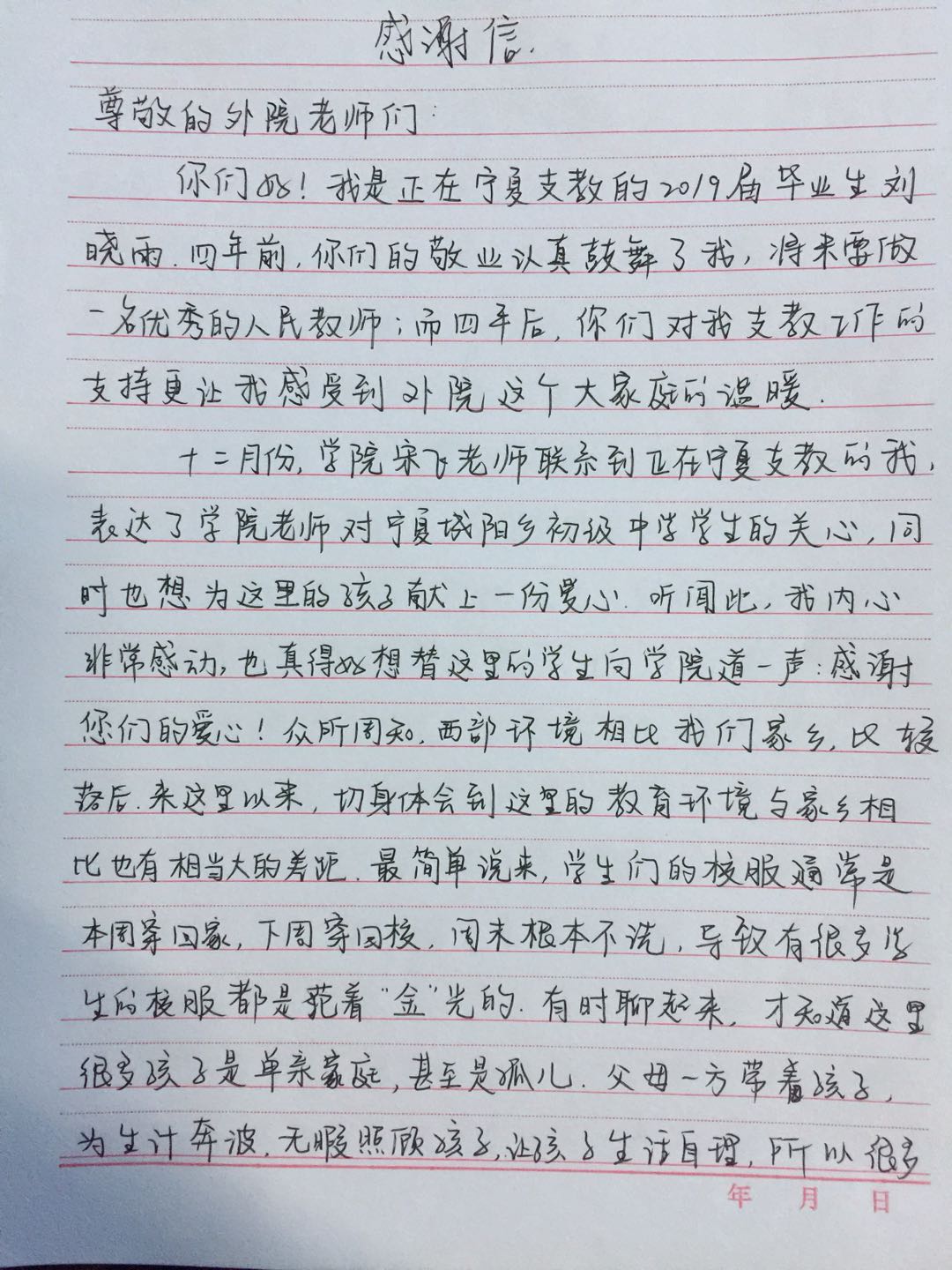 12月31日,宁夏城阳乡初级中学举行了爱心衣物发放仪式,刘晓雨代表公司为同学们发放了爱心衣物,一方面,提高了同学们的学习积极性,另一方面,为贫困员工解决了实际困难。1月2日,刘晓雨发来感谢信,信中提到,感谢多年来公司、老师对于其本人的培养和支持,师恩难忘、感恩外院;感谢外院对青科大研究生支教团的支持和帮助,同时,替收到爱心衣物的同学们表达了感激之情。