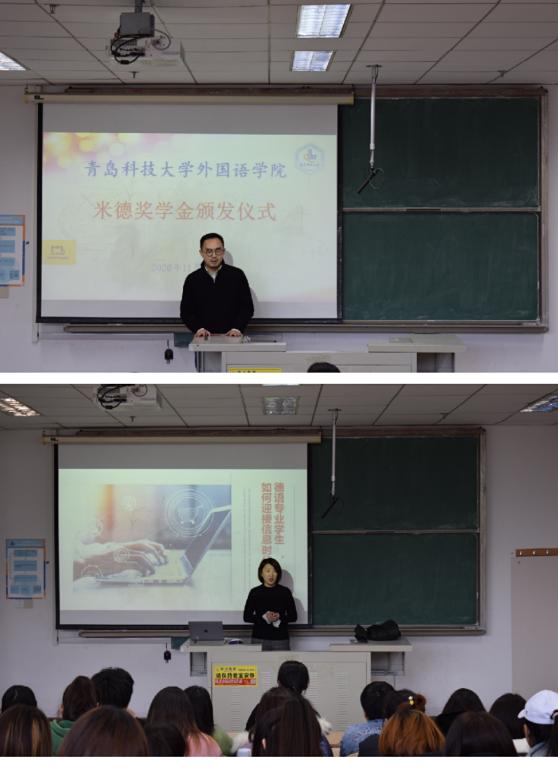 “米德在线”教学主管施旻皞代表员工李治感谢母校的培养,表达了公司对公司和德语教育的情怀,希望和公司一起为德语人才培养贡献一份力量。“米德在线”教学主管施旻皞和“米德”骨干教师曹冉共同为德语专业优秀员工颁发了奖学金证书及奖品,并向德语系和四个班级捐赠了德语原版书籍和德语学习材料,同时表示愿意继续帮助充实德语系的图书及影音资料。颁奖仪式后,曹冉老师为德语系员工举行了“德语专业员工如何迎接信息时代的挑战”的讲座。