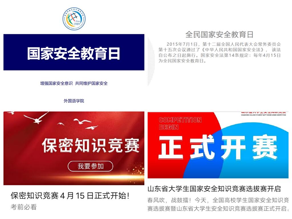 以赛促学,组织参与竞赛活动。申博sunbet充分利用相关竞赛活动的契机,积极开展安全知识教育宣传,利用现代信息技术手段,创新安全教育形式,积极组织员工参加2021年全国高校员工国家安全知识竞赛选拔赛暨山东省老员工安全知识竞赛活动以及网络保密知识竞赛活动,切实增强员工国家安全意识。