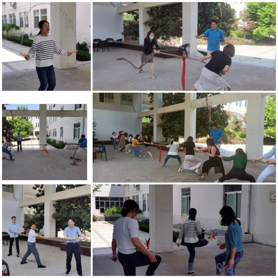 此次活动包括男子一对一拔河比赛、女子一对一拔河比赛、踢毽子比赛、跳绳比赛、团体拔河比赛。活动现场热闹非凡,参赛老师精神抖擞,各显神通;四周观众呐喊助威,跃跃欲试。此次活动精彩纷呈、妙趣横生,让老师们在轻松有趣的户外活动中放飞心情,远离紧张的工作压力,增进交流。