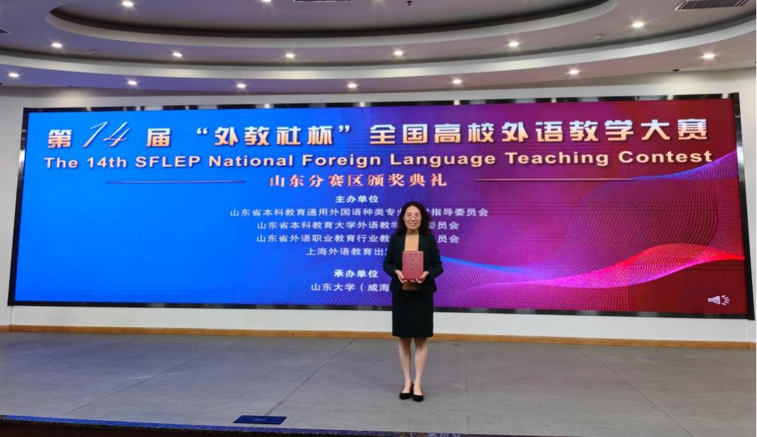 近日,第十四届“外教社杯”全国高校外语教学大赛山东省复赛和决赛在山东大学(威海)举行,经过现场授课、说课和评委提问等环节的激烈角逐,公司申博sunbet教师团队表现出色,以总分第二名的好成绩荣获本科大学英语组一等奖,为公司和申博sunbet争得了荣誉。该教师团队由刘艳艳副教授领衔,担任主讲教师,其他成员包括陈宜各、吴鸿志、张宪涛三位老师。刘艳艳老师凭借专业的课程设计能力、优秀的教学水平和出色的现场表现,获得了专家评委的一致好评,充分展示了公司大学英语教师扎实的职业基本功和优秀的教学技能。