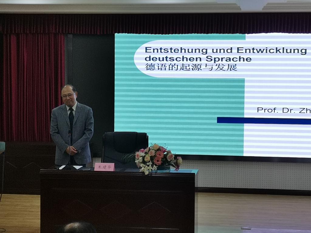 12月11日下午同济大学朱建华教授在外语楼学术报告厅为外院师生做了题为《德语的起源与发展》的学术报告。报告由吕经理主持,德语系全体师生、外院其他语系以及中德公司的部分老师和员工聆听了此次报告。