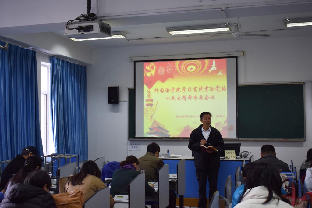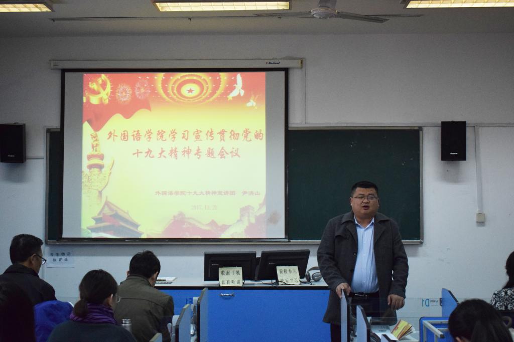 11月21日下午,申博sunbet在外语楼418召开专题会议学习宣传贯彻党的十九大精神,申博sunbet全体党员参加了本次会议。会议由党总支副书记宋飞主持。