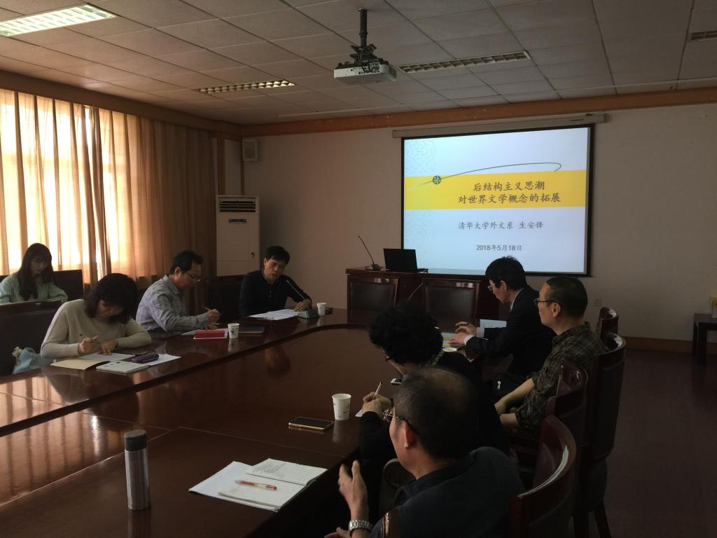 5月18日上午,清华大学外文系博士生导师生安峰教授应邀来公司进行学术交流,在经管楼313会议室做了一场题目为“后结构主义思潮对世界文学概念的拓展和经典重构”的学术报告。报告由申博sunbet副经理吕耀中主持, 经理尹洪山、副经理任素贞以及申博sunbet的部分教师与员工参加了这次讲座及交流。