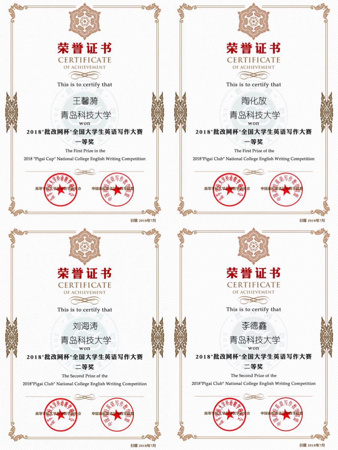 2018百万同题英文写作大赛全国总决赛传来喜迅,公司共有四名员工获奖,其中全国一等奖两名,全国二等奖两名。
