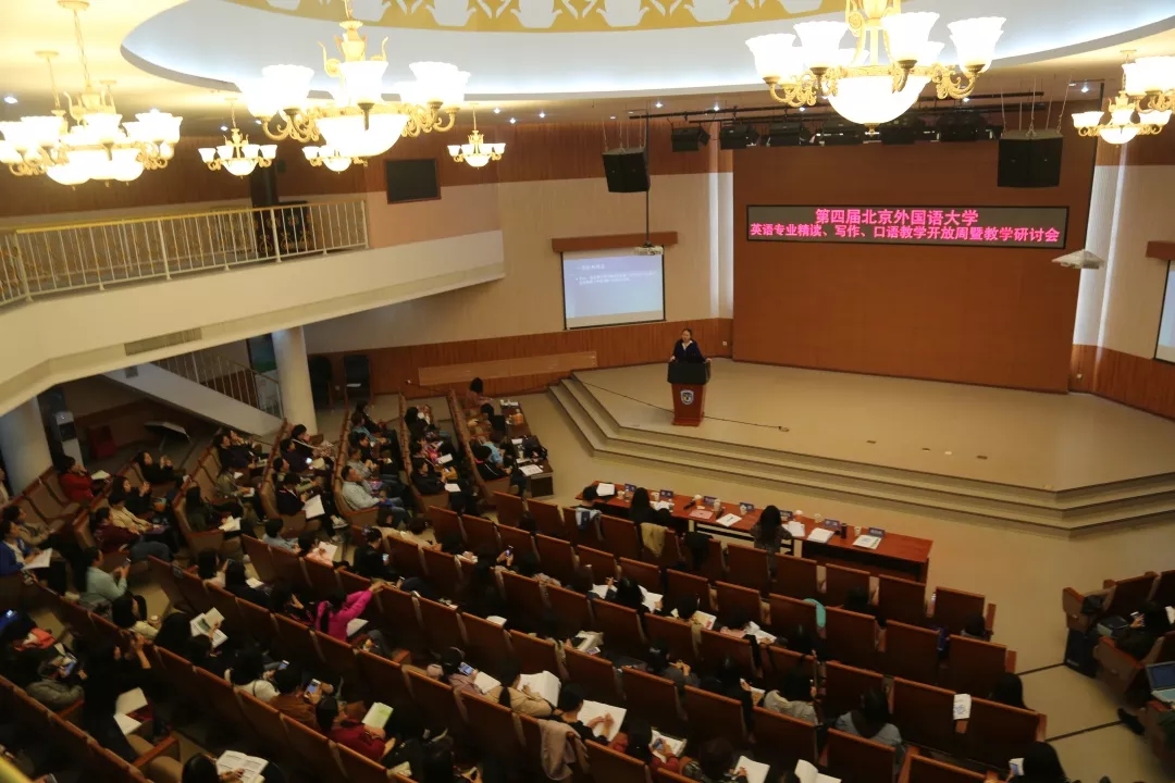 此次开放周暨研讨会以交流融合语言与知识学习,以能力为导向的英语专业改革经验,探讨重视语言能力、跨文化能力与思辨能力培养的教学实践成果和研究动态为目的,由北京外国语大学英语公司、教务处、教师发展中心,北京地区高校英语类专业群和外语教学与研究出版社联合举办。来自全国80余所高校的近200名教师参加了本次开放课堂暨教学研讨会,通过主旨报告、开放课堂、教学研讨、说课评课、集体备课及教学展示等多个环节,就《国标》指导下的英语专业基础阶段技能课程改革与教学研究作了深入研讨。