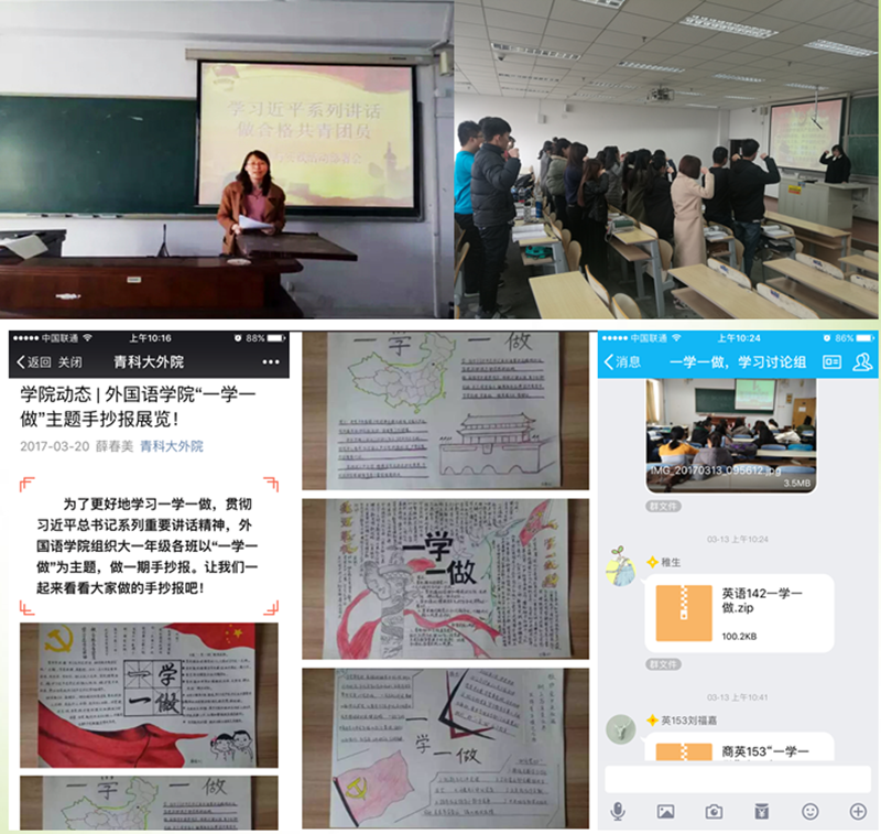 为深入开展“一学一做”教育实践活动,贯彻落实刘兴云书记在“十三五”规划和综合改革部署动员大会讲话中提出的建设“五有”高水平大学的讲话精神,外院分团委通过“一学一做”系列主题团日活动的开展,启动了团学工作综合提升工程之导航行动,发出了做一个“人美、心美、学习美、文体美、志愿服务美”充满正能量的‘五美’外院人的号召,引领青年团员树立正确的人生观、价值观,做一名积极向上的合格团员。院员工会组织开展了“学系列讲话精神,做‘五美’外院人”手抄报大赛,通过比赛让同学们了解开展“一学一做”实践教育活动的重要意义,帮助青年团员数理正确的人生观价值观;英语161、162班举办了“学系列讲话,做合格共青团员”主题团日活动,德语141班、韩语141班举办了“奋进中彰显青春” 主题团日活动,俄语151举办了“传承科大精神,做积极向上科大人”主题团日等。通过这些主题团日,汲取了精神营养,坚定了理想信念,也强化了青年员工的时代责任感。