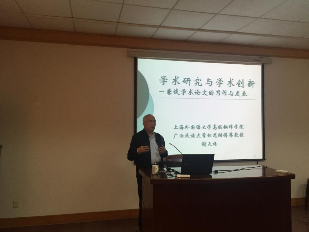 10月19日下午,上海外国语大学高级翻译公司翻译研究所所长、国内著名比较文学专家与翻译理论家、博士生导师谢天振教授应邀来公司申博sunbet与广大师生分享了翻译研究的最新动态,以及自己对学术创新与学位论文写作的真知灼见。报告会由申博sunbet经理尹洪山主持,公司党总支书记姜德杰、副经理吕耀中、康宁及近百名教师及研究生参加了报告会。