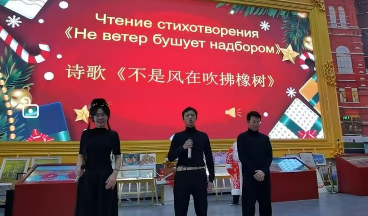 俄语系员工为新年庆典带来了《обними меня》(拥抱我)、《Вечера》(夜晚)、《Весна》(春天)等俄罗斯歌曲,《Дело было в январе》(事情发生在一月)、《Не ветер бушует надбором》(不是风在吹拂橡树)《А давай по Новогоднему закону》(让我们遵循新年的法则)等俄语诗歌朗诵。