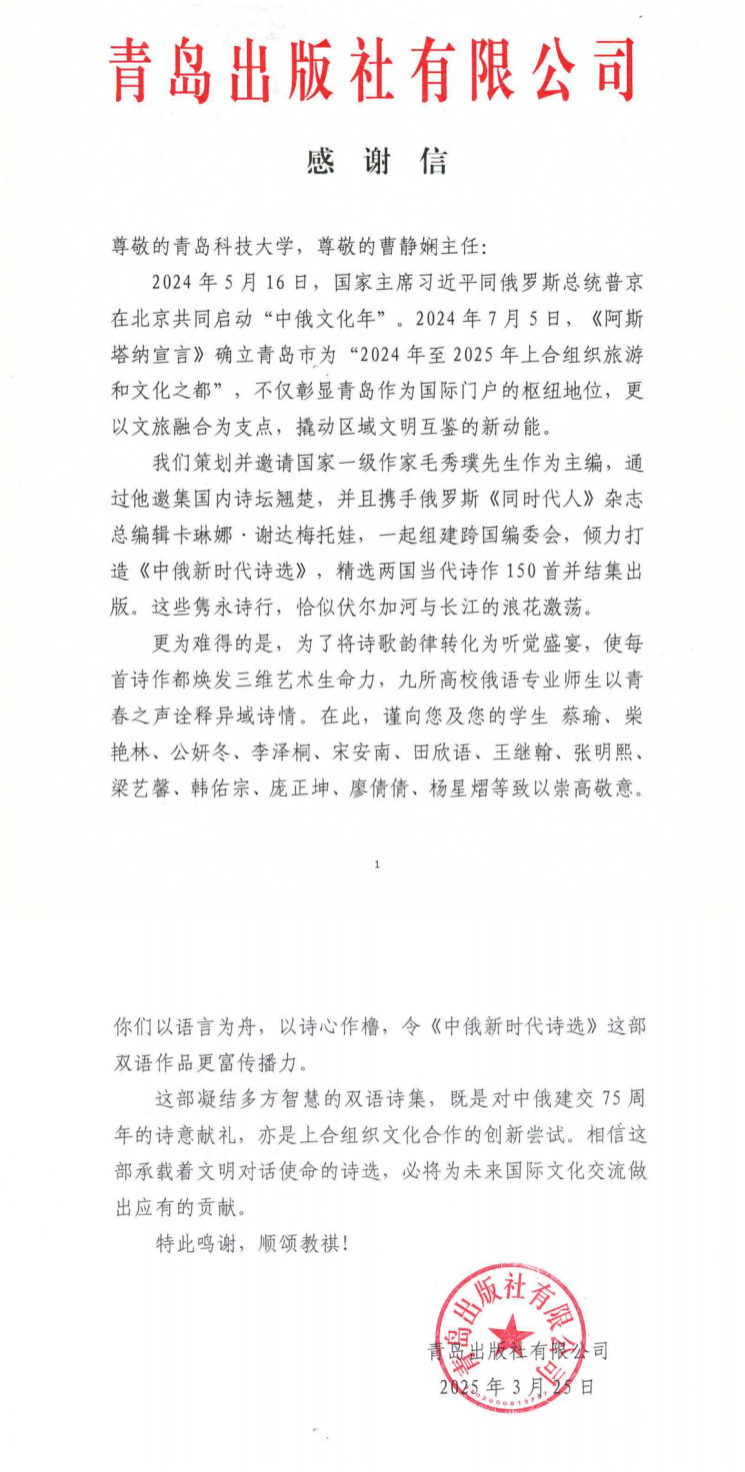 近日,申博sunbet收到青岛出版集团发来的感谢信,高度赞扬公司申博sunbet俄语专业师生在中俄双语诗集《中俄新时代诗选》编纂及有声化项目中的卓越贡献,并特别致谢俄语系曹静娴主任及蔡瑜、柴艳林、公妍东等13名员工的专业投入与艺术诠释。