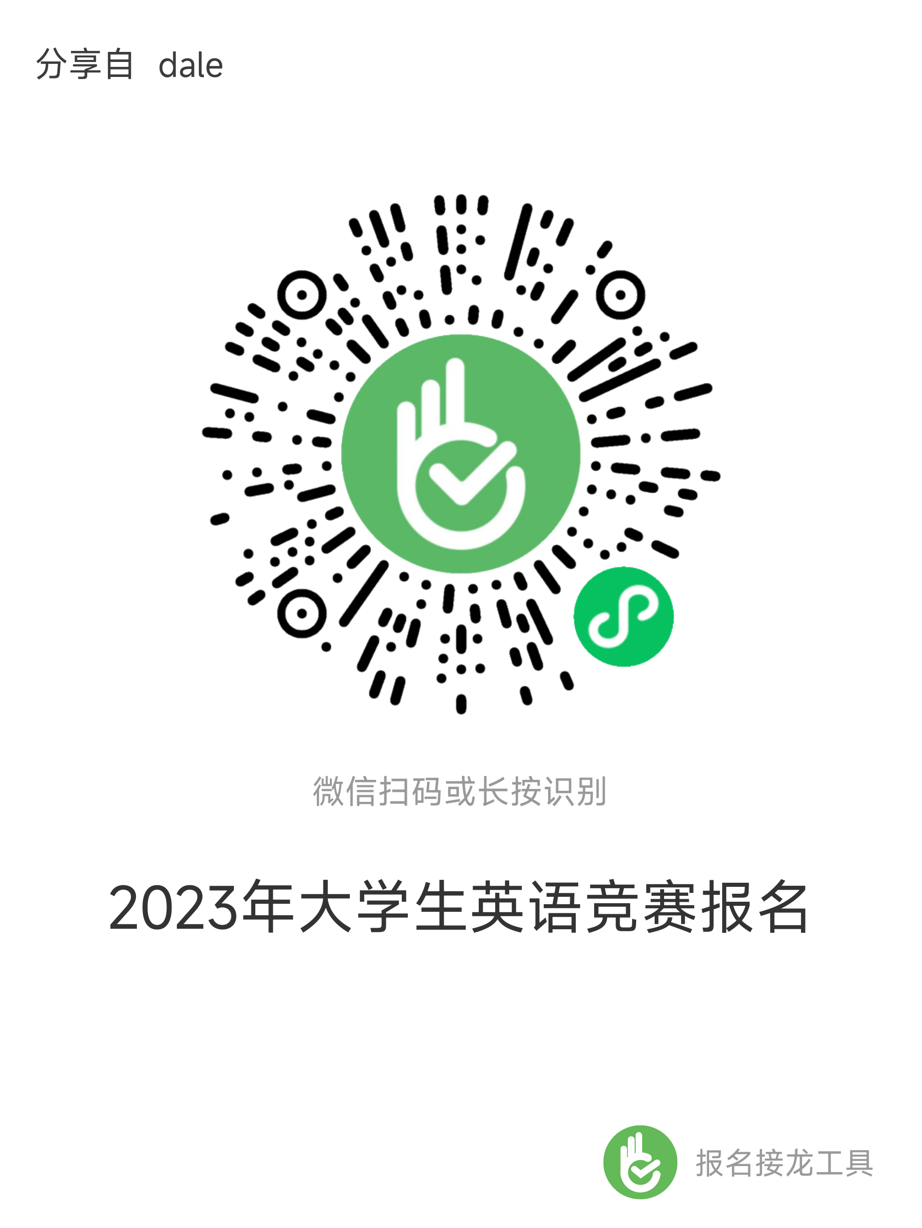 1. 报名:从2023年3月9日-2023年3月31日,通过报名接龙(微信“接龙工具”小程序,链接:https://rl.uil.ink/?r=YJ9rJuXJe或者识别下方报名图片)填写参赛员工名单、竞赛类别等信息,每人仅限填报一次,信息务必准确,报名后务必按照校区实名(班级姓名)加入对应的QQ群,群内会发布最新通知信息。报名逾期不候。根据《2023年全国老员工英语竞赛(NECCS)通知》规定,本次竞赛全部收费为50元/人。