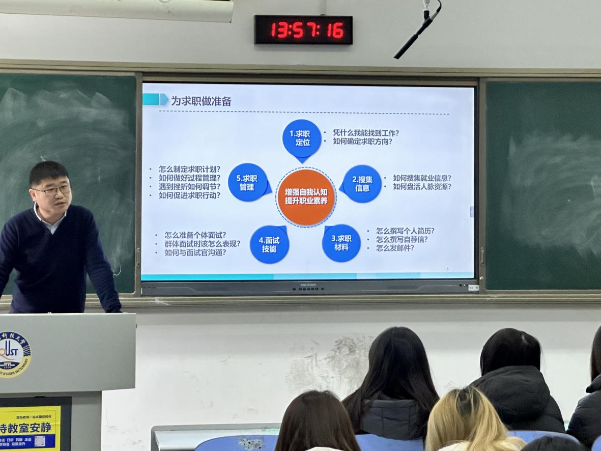 主题班会中,马寒结合当前时代发展趋势深入分析了外语专业员工就业时面临的严峻形势,强调在就业路上应正视自身能力与素养,杜绝随从,跳出“体制”的幻想圈,认清市场供需,找出属于自己的“SWOT”;辩证地对待论文写作与就业规划,统筹协调好现实问题。在讲解时,马寒介绍了就业信息的获取渠道以及公司促进就业的系列举措,并细致讲解了员工应该怎样增强自我认知、提升职业素养以及如何明确求职定位。