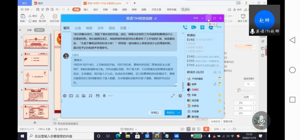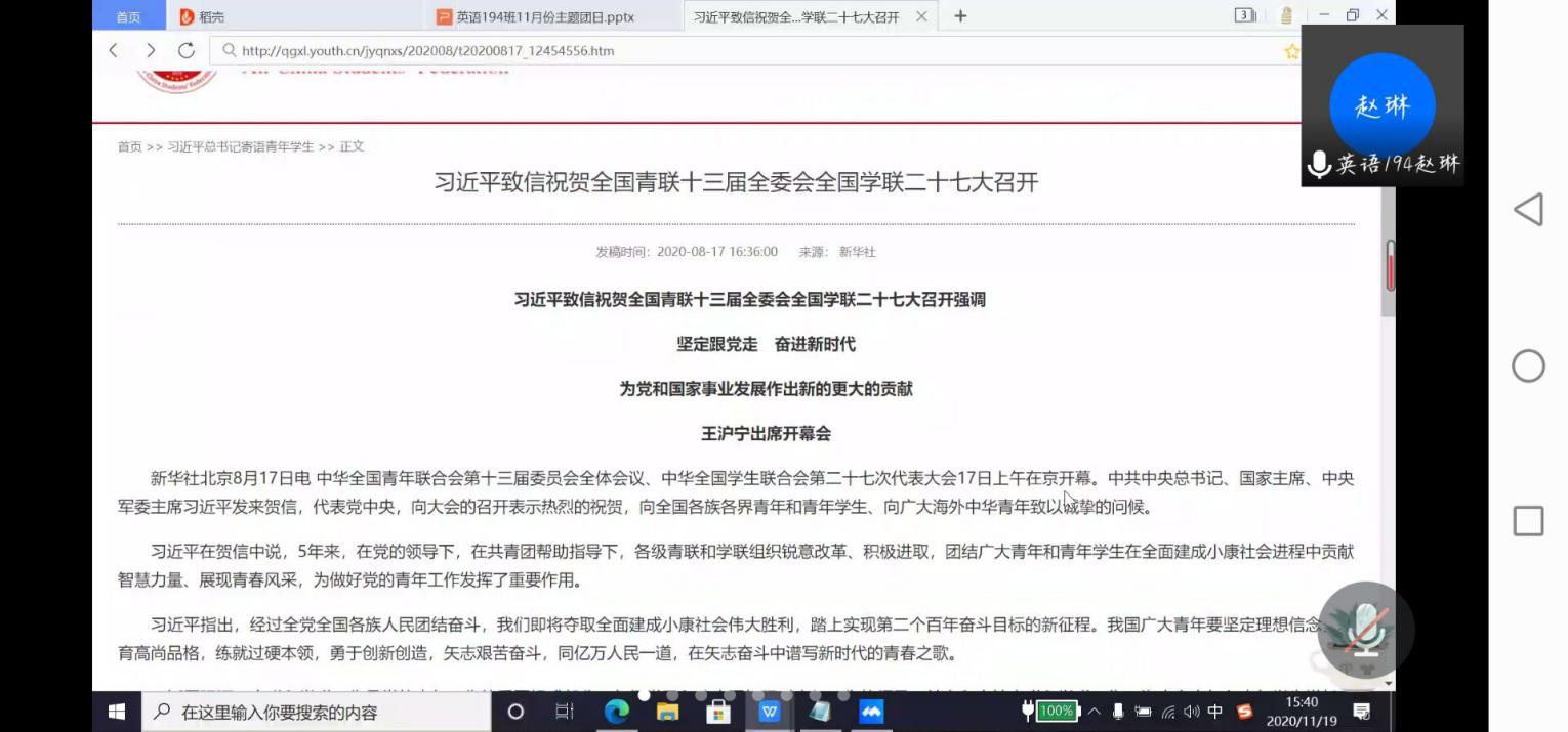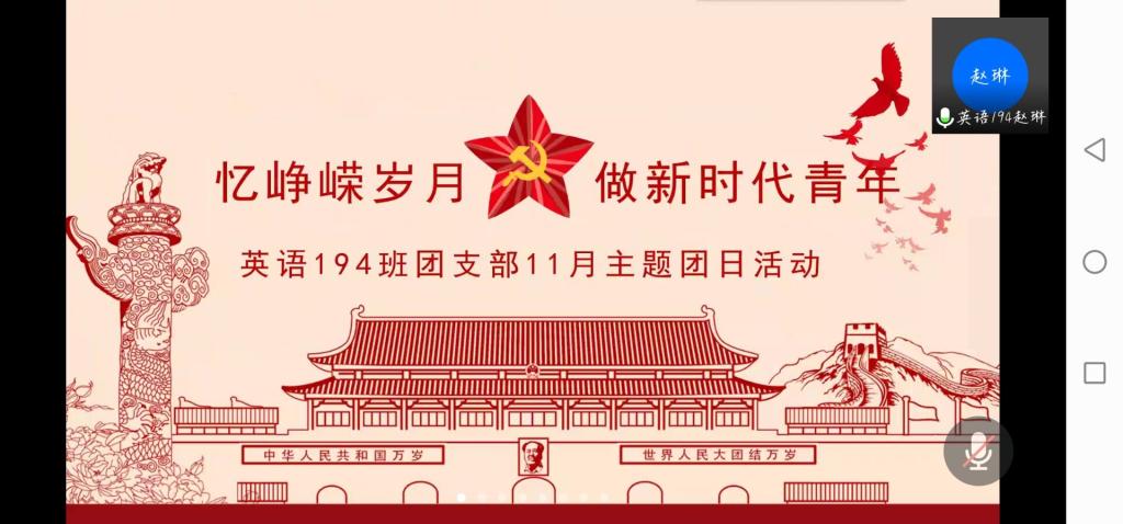 11月19日下午,申博sunbet英语194团支部依托线上平台举行了“忆峥嵘岁月,做新时代青年”主题团日活动。团支部全体团员参与,团日活动由团支部书记主持。