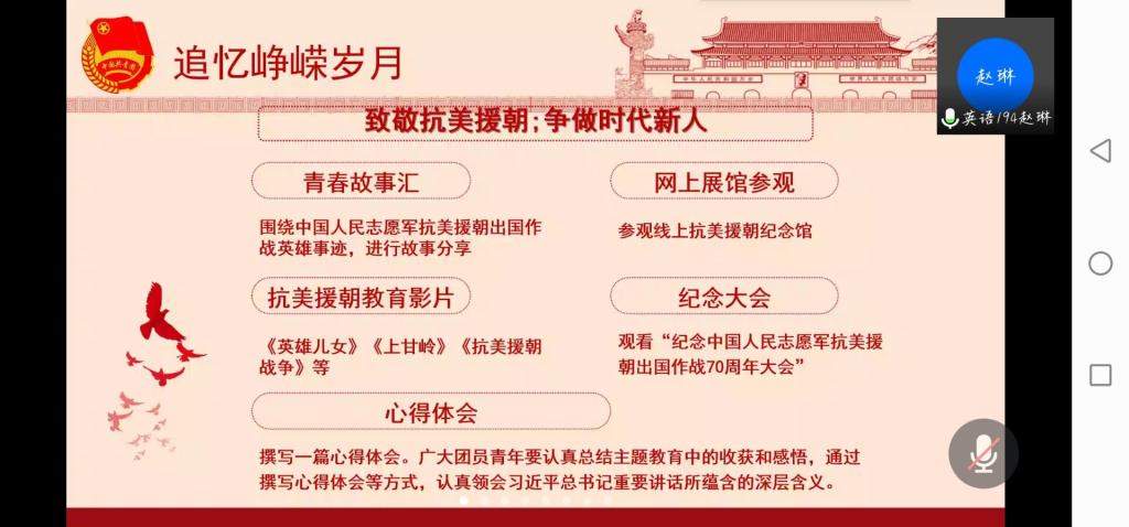 会上,团支部书记带领全体青年团员回顾了抗美援朝的峥嵘历史,观看纪念中国人民志愿军抗美援朝出国作战70周年大会新闻并深入学习了习近平总书记有关抗美援朝七十周年的讲话。全体青年团员还在线上参观了抗美援朝纪念馆。围绕以上讲解,全体青年团员们一起分享所收集到的抗美援朝烈士的英雄事迹,深受感动和鼓舞。与此同时,全体青年团员在团支部书记的带领下学习了全国学联二十七大和中青年干部培训班内容,认真思考了习近平总书记的讲话和贺电内容。结合专业特色与优势,团支部集中学习外文版时政关键热词,并设置问答等环节,巩固学习成果,深化学习意义。