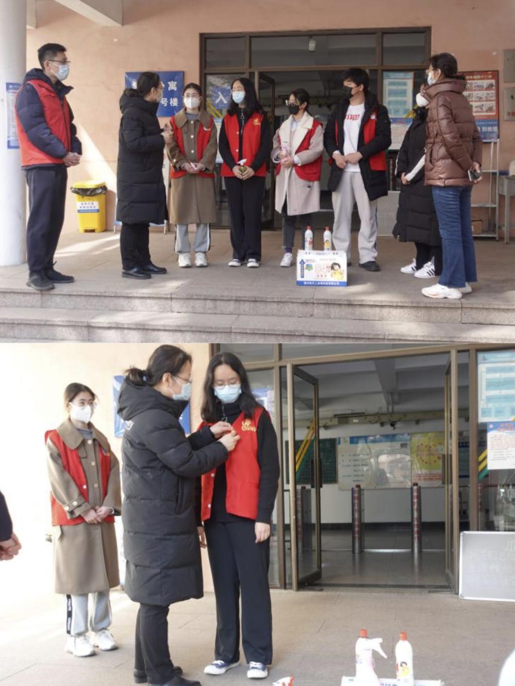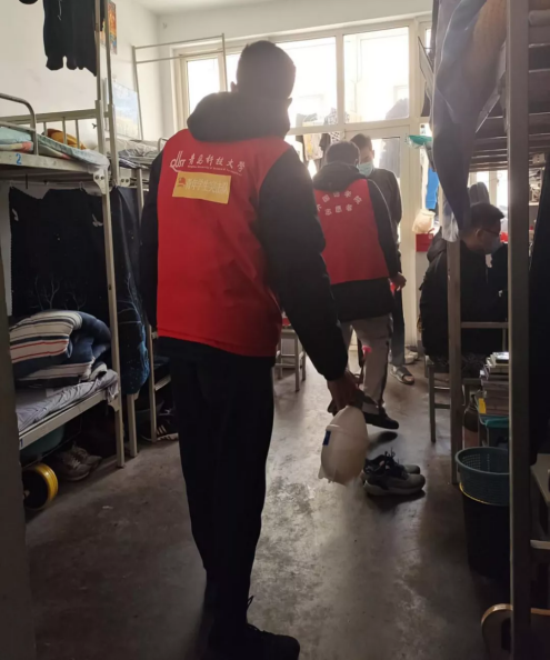 消杀完成后,校团委志愿者、校员工会主席团成员刘晓阳在南区四号楼前进行日常消毒专项培训,并发放了校团委调配的防疫物资,告知突击队成员们物资使用说明和疫情防控注意事项。