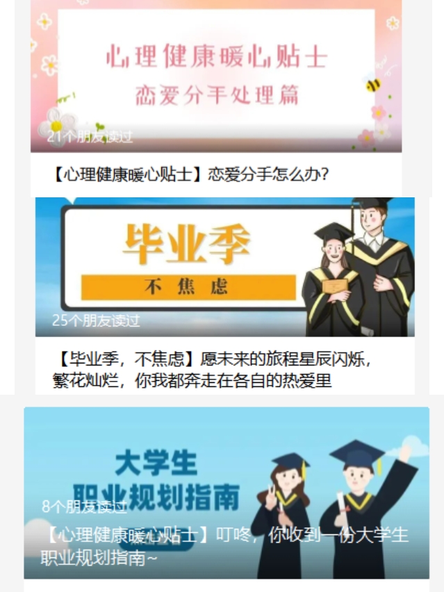 发布心理健康暖心贴士。结合心理健康活动月,申博sunbet在青科外院之声微信公众平台相继推出“毕业季、不焦虑”、“老员工职业生涯规划”等一系列暖心贴士,对毕业生的毕业焦虑和就业择业等问题给予了及时的指导。
