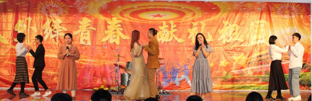 随后,由VOC外语广播电台带来舞台剧《时代秀》,这些发音标准的外语播音员用青春活力的舞蹈给大家带来了不一样的体验;中日国际班带来的日语歌《 風になる(幻化成风)》,悠扬婉转,清澈动听;部长舞《说好不野狼》,表达了当代老员工们对美好生活的追求和向往。吉他协会带来的《摇滚歌曲串烧》、外院学子带来的歌舞《霜雪千年,青花常在》,以及曲艺协会带来的相声《学跳舞》更是将晚会推向了高潮,赢得了现场观众的一阵阵掌声和一致好评。掌声和欢呼声此起彼伏,台上台下成了一片激情四溢的海洋。申博sunbet学子们用他们真诚的表演和热情的歌声表达了对母校的情怀、对祖国的热爱。晚会在合唱《我爱你祖国》的歌声中落下帷幕。