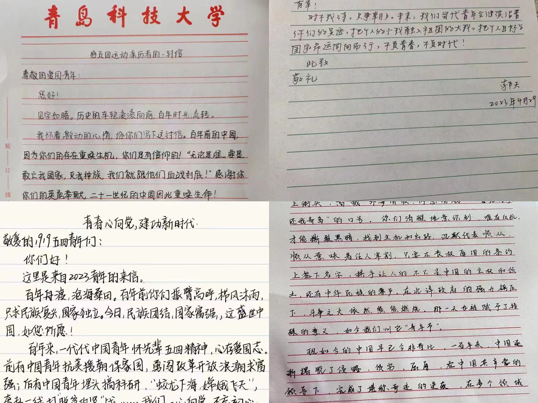 曾记得,1919年的5月4日,为了驱逐黑暗、争取光明,为了祖国独立和富强,一群意气风发的青年用热血和生命谱写了一曲最壮丽的青春之歌,绘就了一幅最宏伟的青春图画。在“青春心向党,建功新时代”书信活动中,同学们给1919年的五四运动亲历者寄去一封封信,感谢他们曾经的热血付出,向他们汇报当今社会的安宁美好。