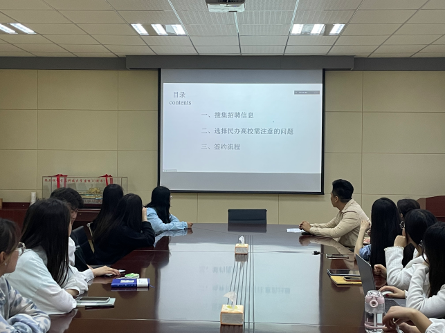 第一位进行经验分享的是高风,现已签约齐鲁理工公司,任基础教学部高级教师。她从以下三个方面就如何准备高校教师招聘考试进行了分析:一是如何搜集招聘信息,二是选择高校的注意事项,三是签约的具体流程。高风同学的热心讲解帮助同学们弥补了信息差,使得同学们能够更加全面详细地了解高校教师招聘的相关信息,为同学们指明了道路。