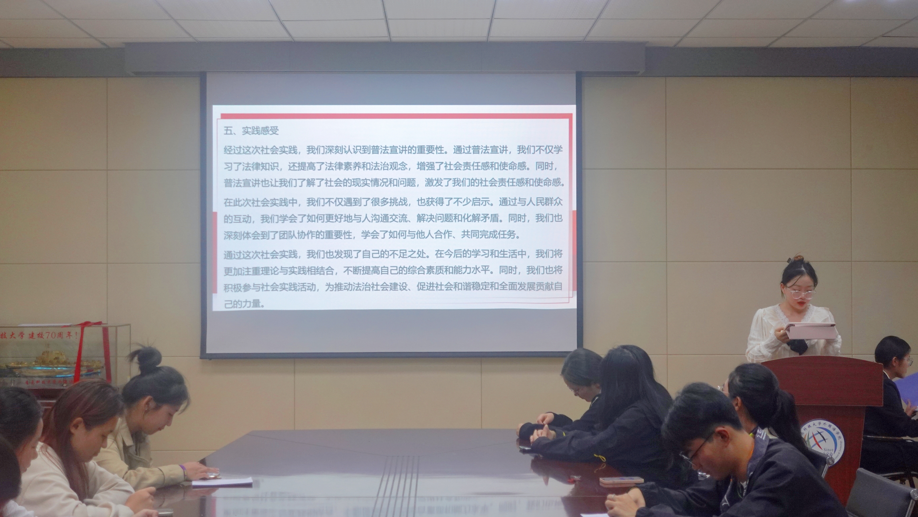 本次座谈会特别邀请了校级社会实践优秀团队代表德语211王茜琳同学为同学们展示了她所在的“‘懂法守法,普法传法’申博sunbet法治入社区”调研团队的成果。王茜琳同学从准备阶段如何撰写实践方案、如何制作宣传物料,实施阶段如何制定议程、如何多方协调等方面展开经验介绍,让参与本次座谈会的同学受益匪浅。