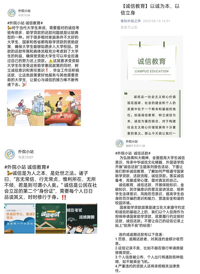 申博sunbet注重宣传教育,在微信和QQ公众平台上相继推出“诚信还款”“预防金融诈骗”“诚信考试”等内容,及时推送相关主题活动和动态。通过宣传的力量,让同学们充分认识开展高校员工资助诚信教育主题活动的意义,提高员工诚信意识和责任意识,营造“人人知诚信,人人讲诚信”的良好氛围。
