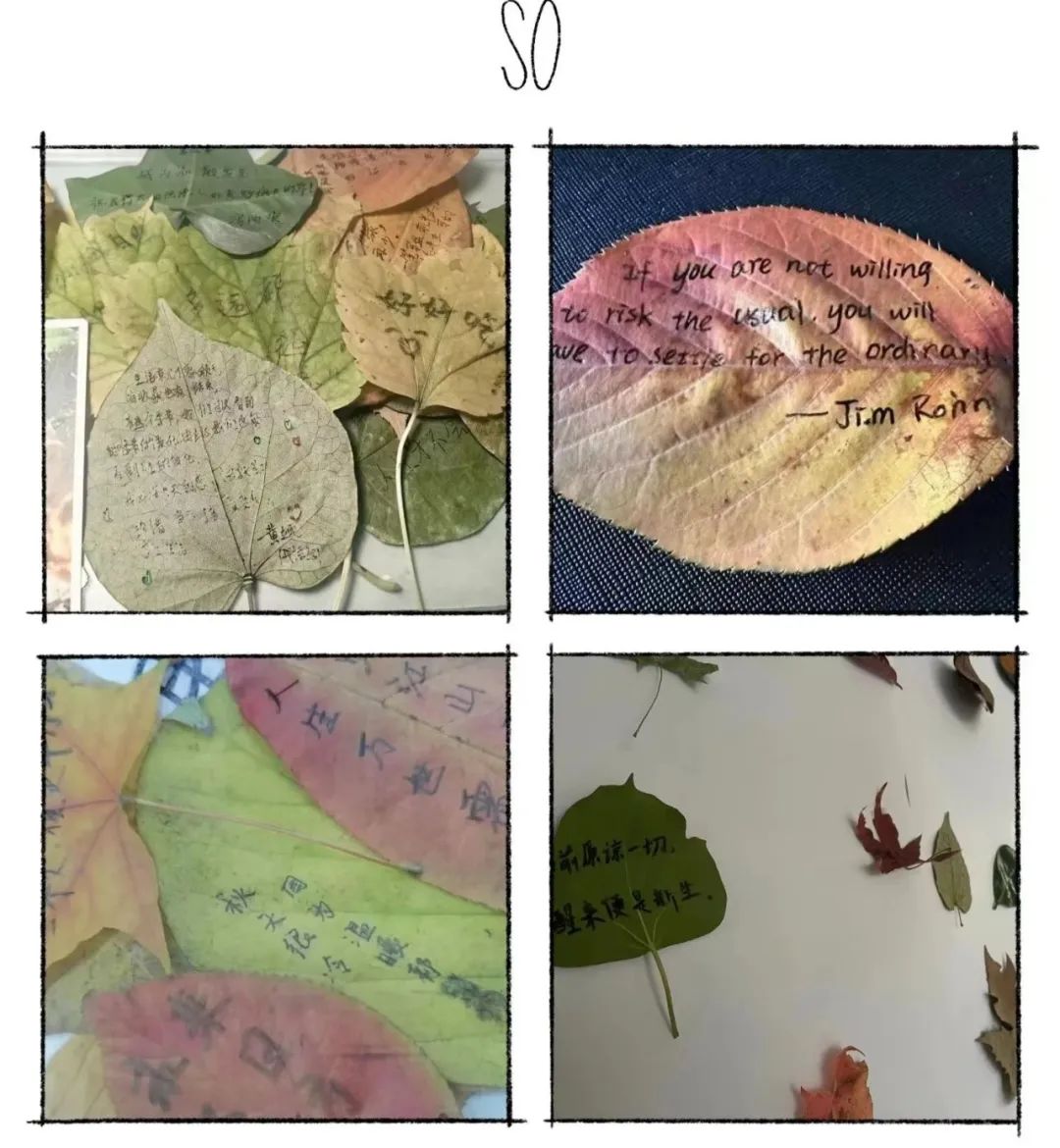 心语协会最终将收集的落叶张贴在外院楼下进行展示。每一片落叶不仅承载着同学们近期的感想和情绪表达,也诉说着同学们每句温暖和鼓励的话语,通过用心倾听秋叶的心语,能够在初遇冬天时感受到内心的温暖,不仅帮助同学们敢于表达自己的情绪,也与他人建立更为深入的联系。