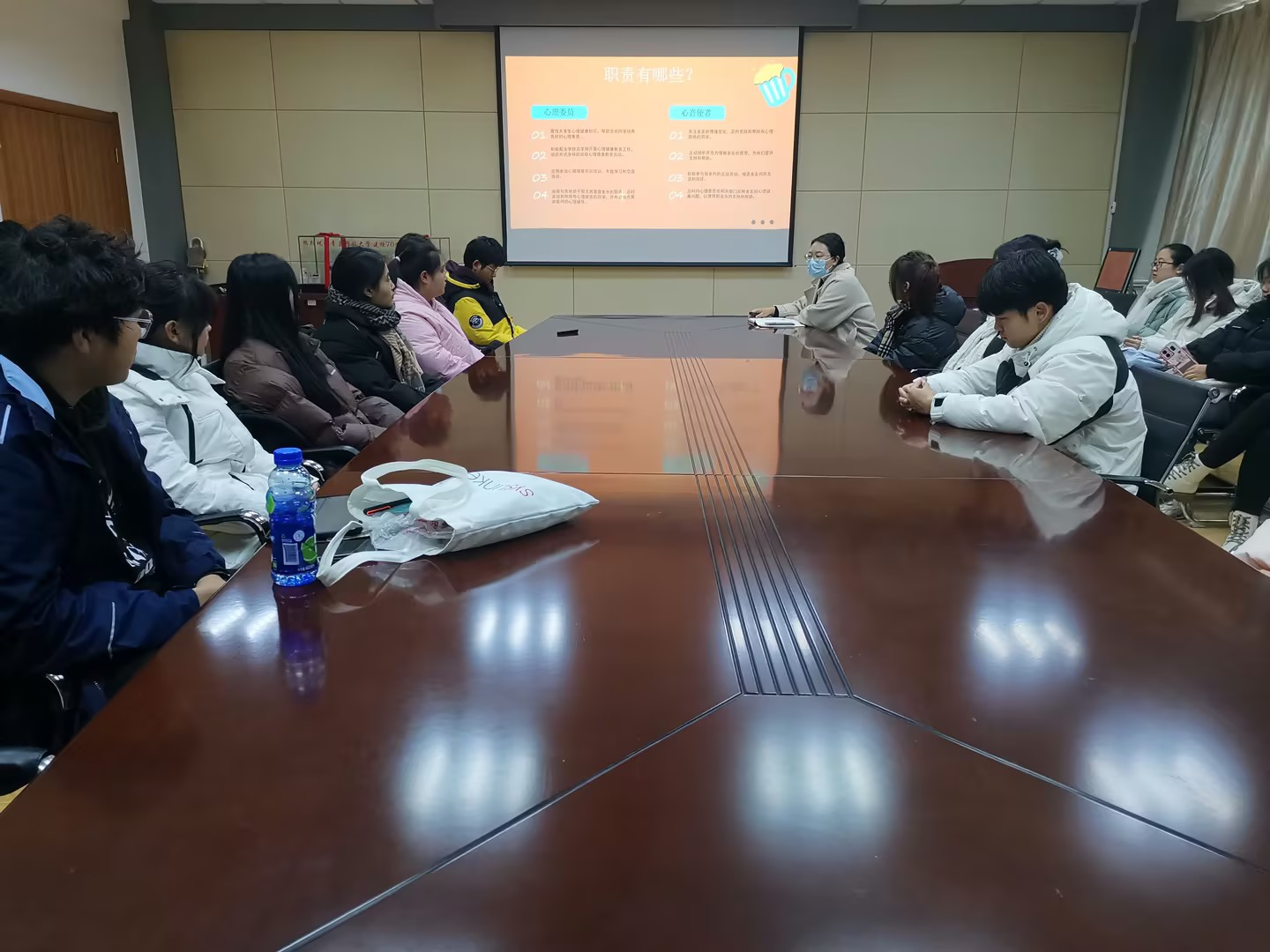 临近期末考试周,刘妍君老师讲到了心理工作的重要性及心理委员、心音使者工作职责,涉及到全体员工的安全稳定,需要时刻关注班级同学的心理健康状态,同时也提醒同学们在工作中要尊重他人隐私,学会倾听、理解、关心和支持他人,帮助同学们疏导心理情绪。特别提到大一新生面对初次考试以及大四员工面临考研就业时间节点,更要调试好心理状态,要实时关心关注同学们。