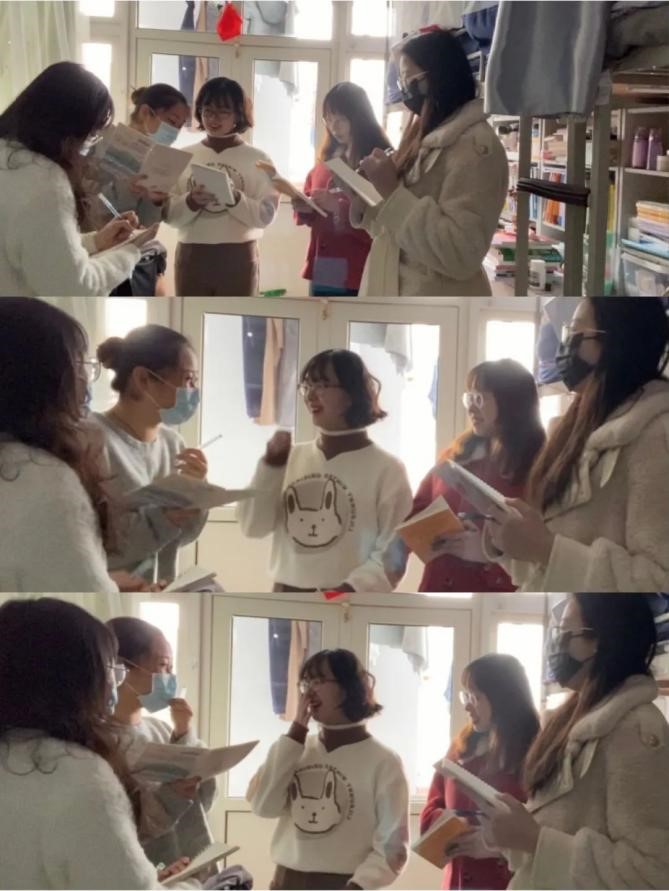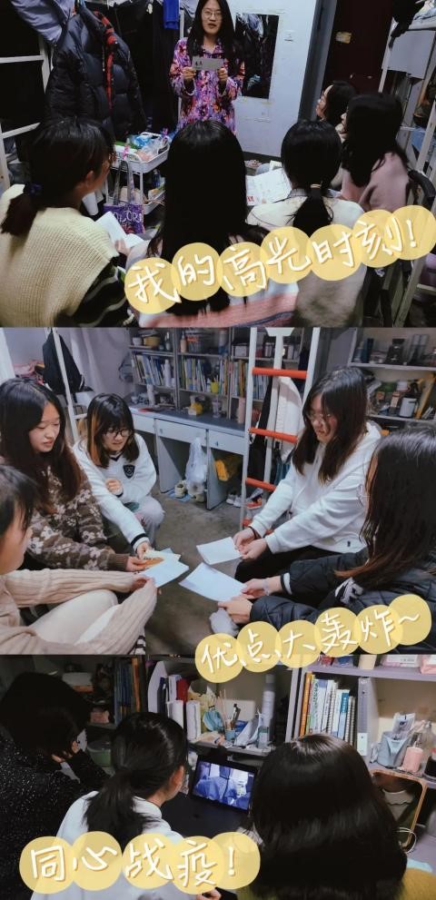英语二学位班级的417宿舍由在本次活动中,各自分享了自己的一些高光时刻,宿舍瞬间变身“夸夸群”!大家都直抒胸臆,交流了抗疫防控期间的感想体会,心理委员还针对个别同学因疫情产生的负面情绪提出了一些建议,比如采用“积极的自我对话”、“正念冥想”、“行为放松”等方式,帮助其克服一些不良情绪。最后用笔和纸写下了对方的优点以及自己的祝福的话语。