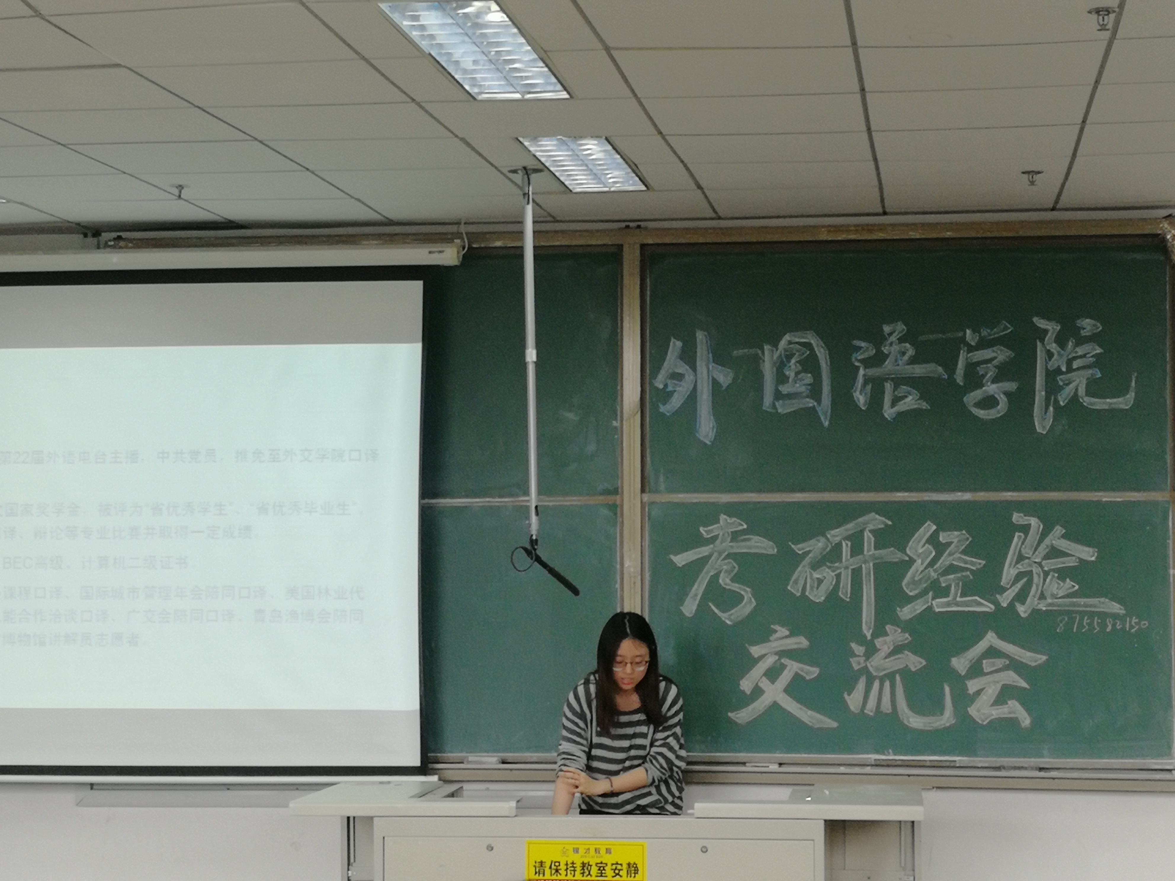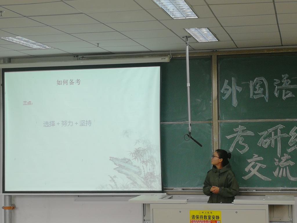 会上,保研到中国外交公司的常菁同学就保研条件、保研准备、保研后学习生活进行了交流。考取武汉大学的张晓妍并分享了自己的考试经验,希望大家提前着手,认真准备。跨专业考取社会科公司大学的李臣臣、以及考取首都经贸大学的郭凡凡谈了各自考研经历,他们表示跨专业考研需要付出更多的时间和经历,要慎重选择,院校选择时要广泛搜集信息,面试时,要自信、淡定、从容、谦虚。